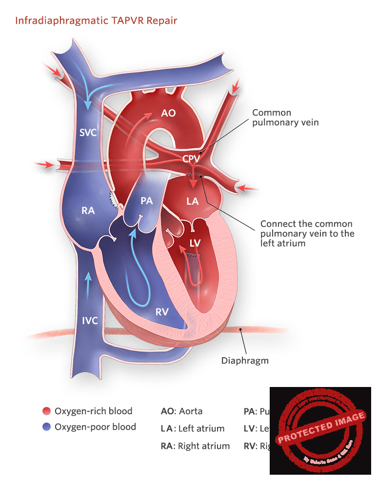 (الوصلة الوريدية الرئوية الشاذة الكلية؛ TAPVC) في العود الوريدي الرئوي الشاذ الكلي total anomalous pulmonary venous return، تقوم الأوردة الرئوية، وهي الأوعية الدموية التي تحمل الدم المؤكسج عادة من الرئتين إلى الجانب الأيسر من القلب، بالارتباط بدلًا من ذلك بالجانب الأيمن من القلب؛ثم يجري هذا الدم إلى القلب الأيسر من خلال ثقب في الجدار يفصل بين غُرف القلب اليسرى واليمنى. يمكن أن تظهرعند الأطفال الذين يعانون من العود الوريدي